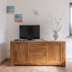 On the ground floor there is a dining room with sofa and TV, a large and fully equipped kitchen, one double bedroom with private bathroom, a second double bedroom, a third twin bedroom and a second bathroom.