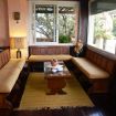 Large living area with wicker sitting corner and fabric sofas, plus an area with wooden seating and locally crafted furniture, both with large sea-view windows